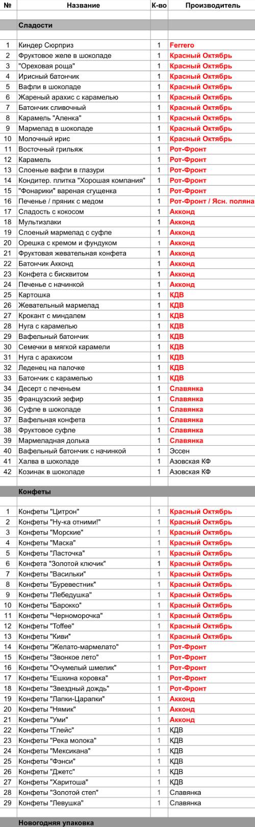 Картошка (1 шт), Жевательный мармелад (1 шт), Крокант с миндалем (1 шт), Нуга с карамелью (1 шт), Вафельный батончик (1 шт), Семечки в мягкой карамели (1 шт), Нуга с арахисом (1 шт), Леденец на палочке (1 шт), Батончик с карамелью (1 шт), Конфеты "Глейс" (1 шт), Конфеты "Река молока" (1 шт), Конфеты "Мексикана" (1 шт), Конфеты "Фэнси" (1 шт), Конфеты "Джетс" (1 шт), Конфеты "Харитоша" (1 шт)